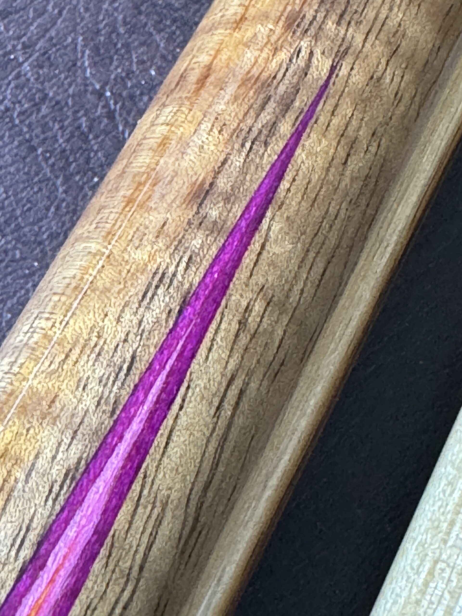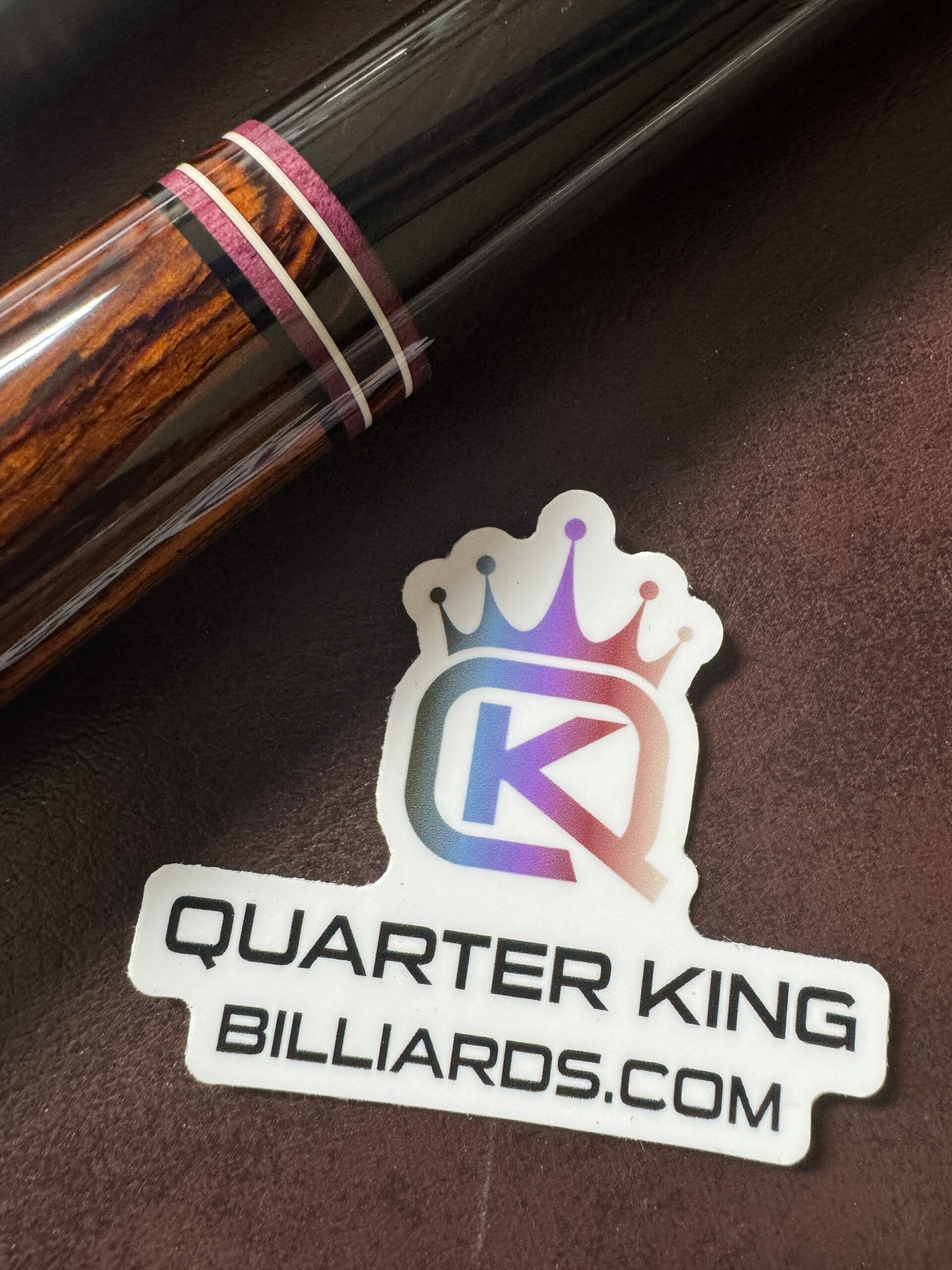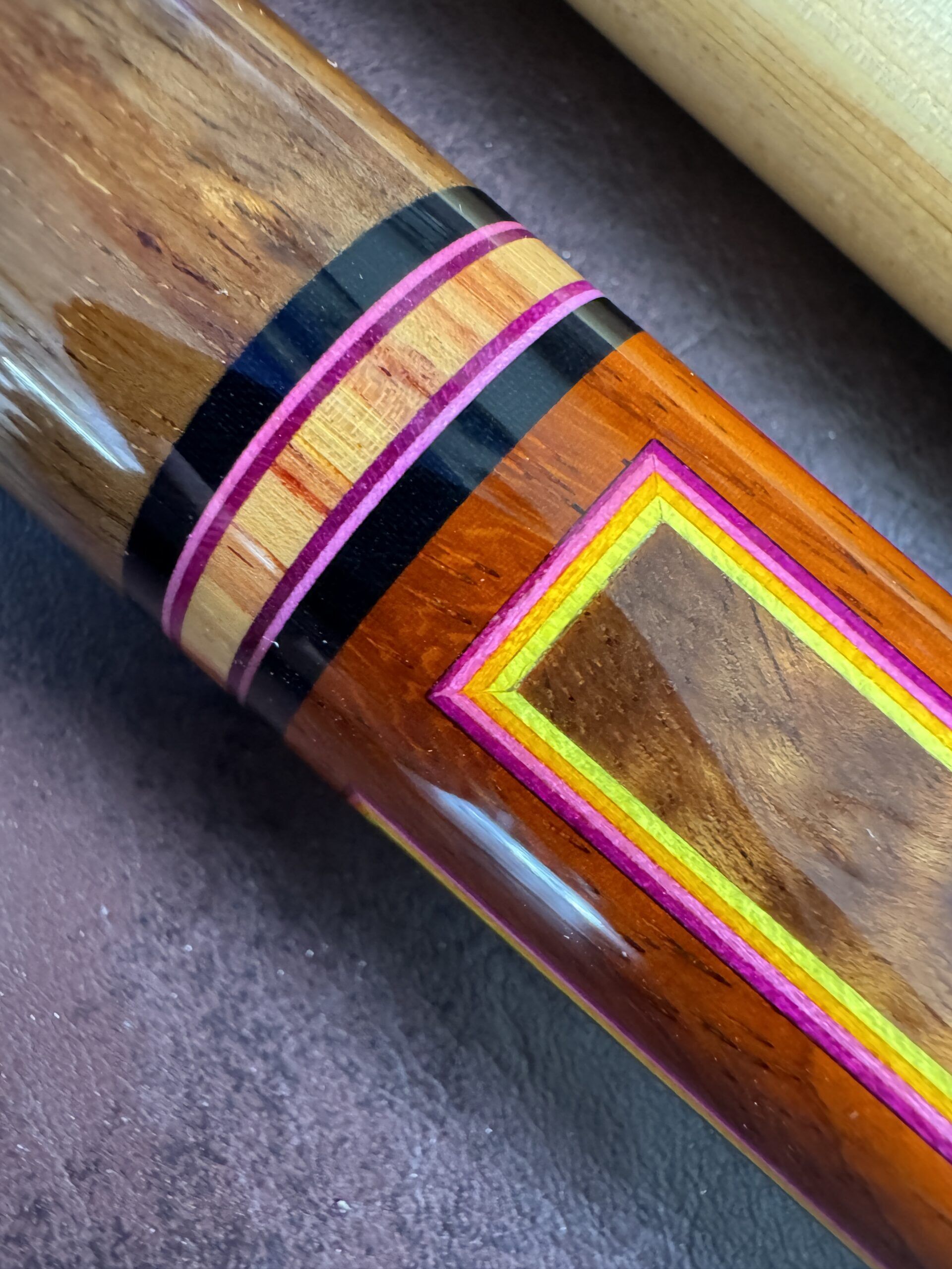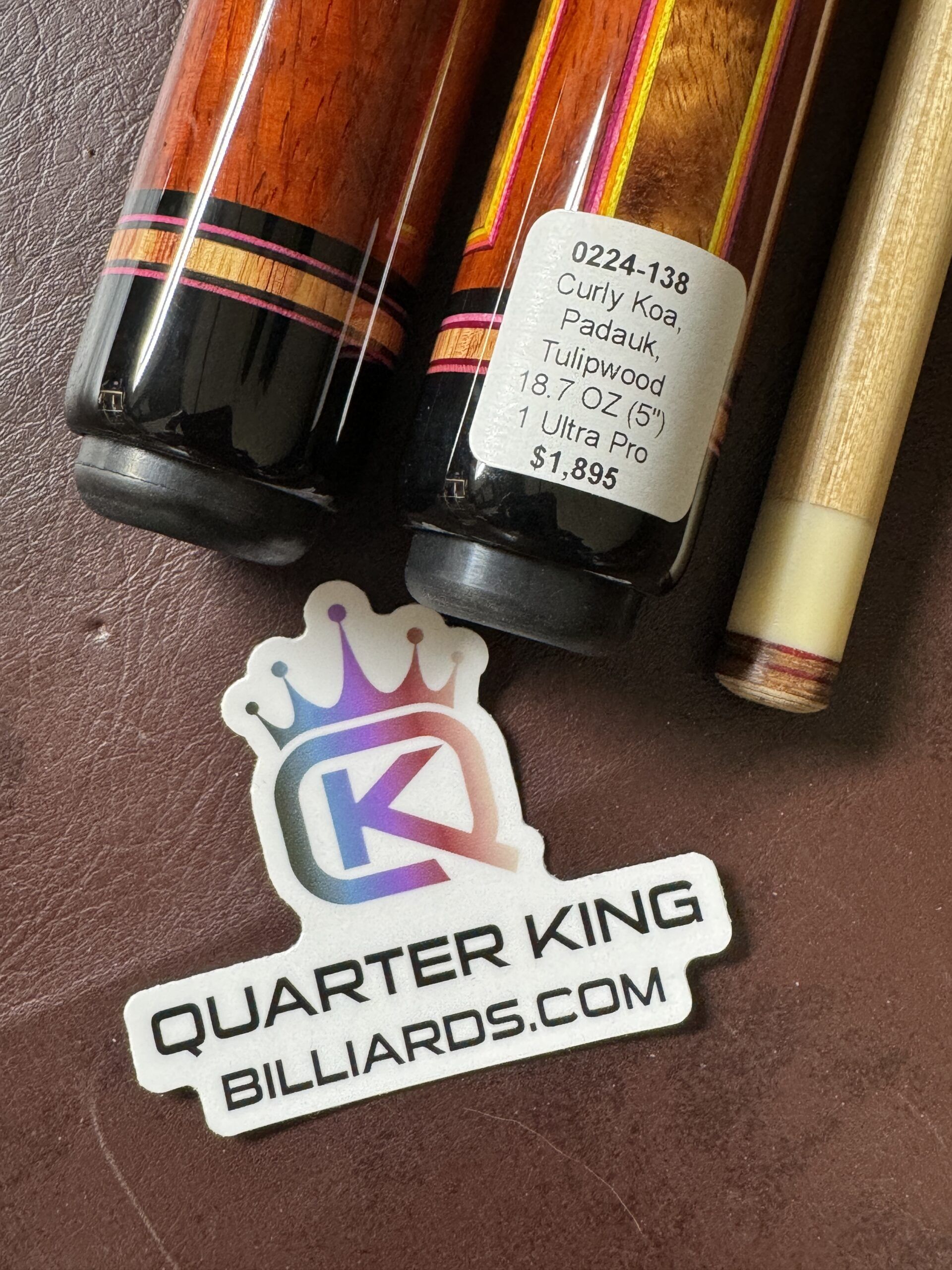 Stunning Curly Koa, Padauk, Tulipwood, beautiful 4 point forearm, and 4 window butt sleeve. The warmth of this cue can’t even be seen in a picture. Ring work and color balance is amazing!