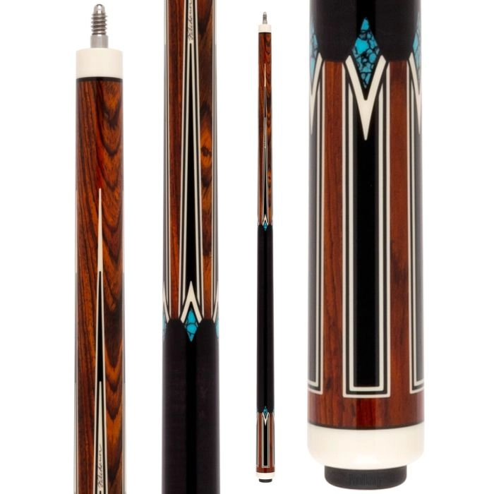 Pechauer Custom Cues have been handcrafted in Green Bay, Wisconsin since 1963 — three generations of American cue-making. The Pechauer PEC17 N Series showcases cocobolo — a dense, fiery red-brown South American hardwood — framed with white, black and turquoise diamonds on both the forearm and butt sleeve.