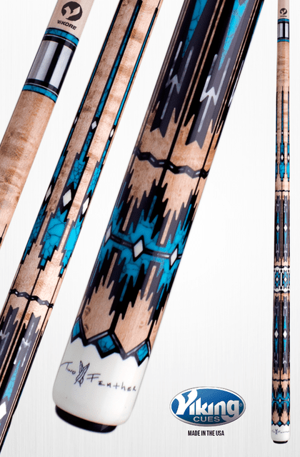 Viking Two Feathers White Wolf Cue featuring 342 inlays with ebony, white pearl, IMA Ivory, turquoise and silver rings. ViKORE Performance shaft with inlays. Lifetime warranty and made in the USA!